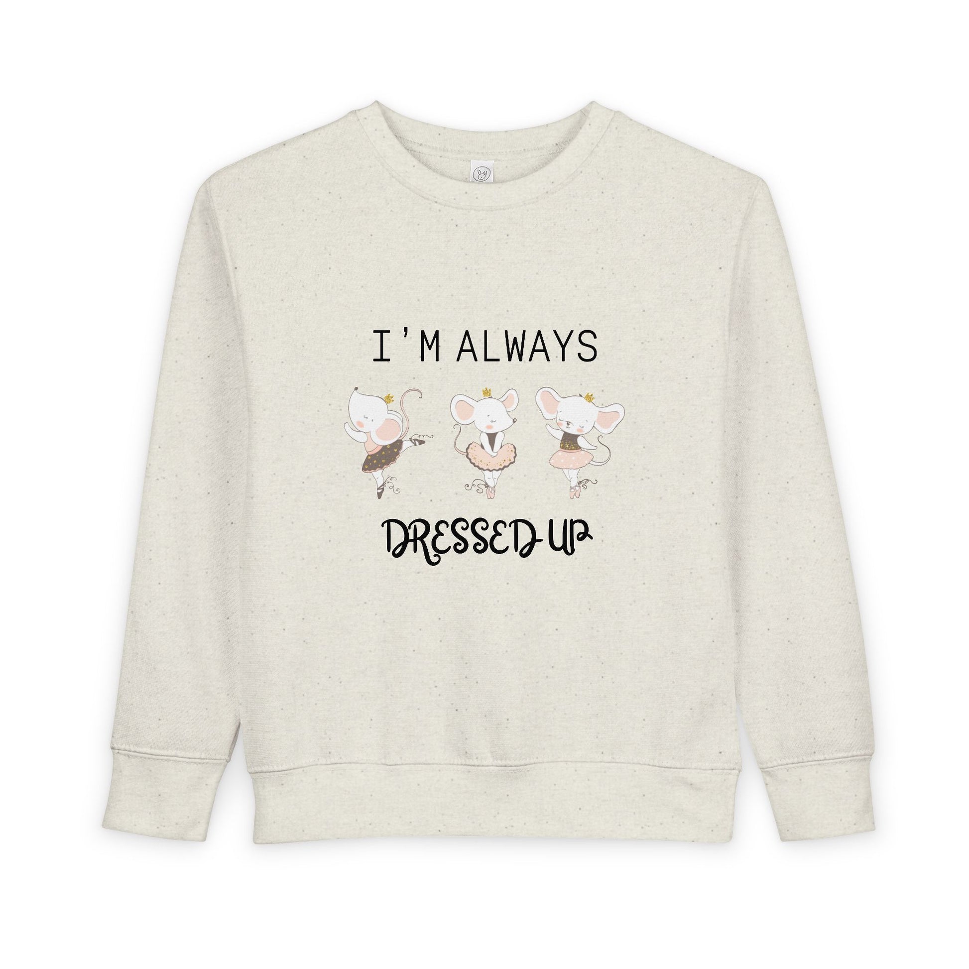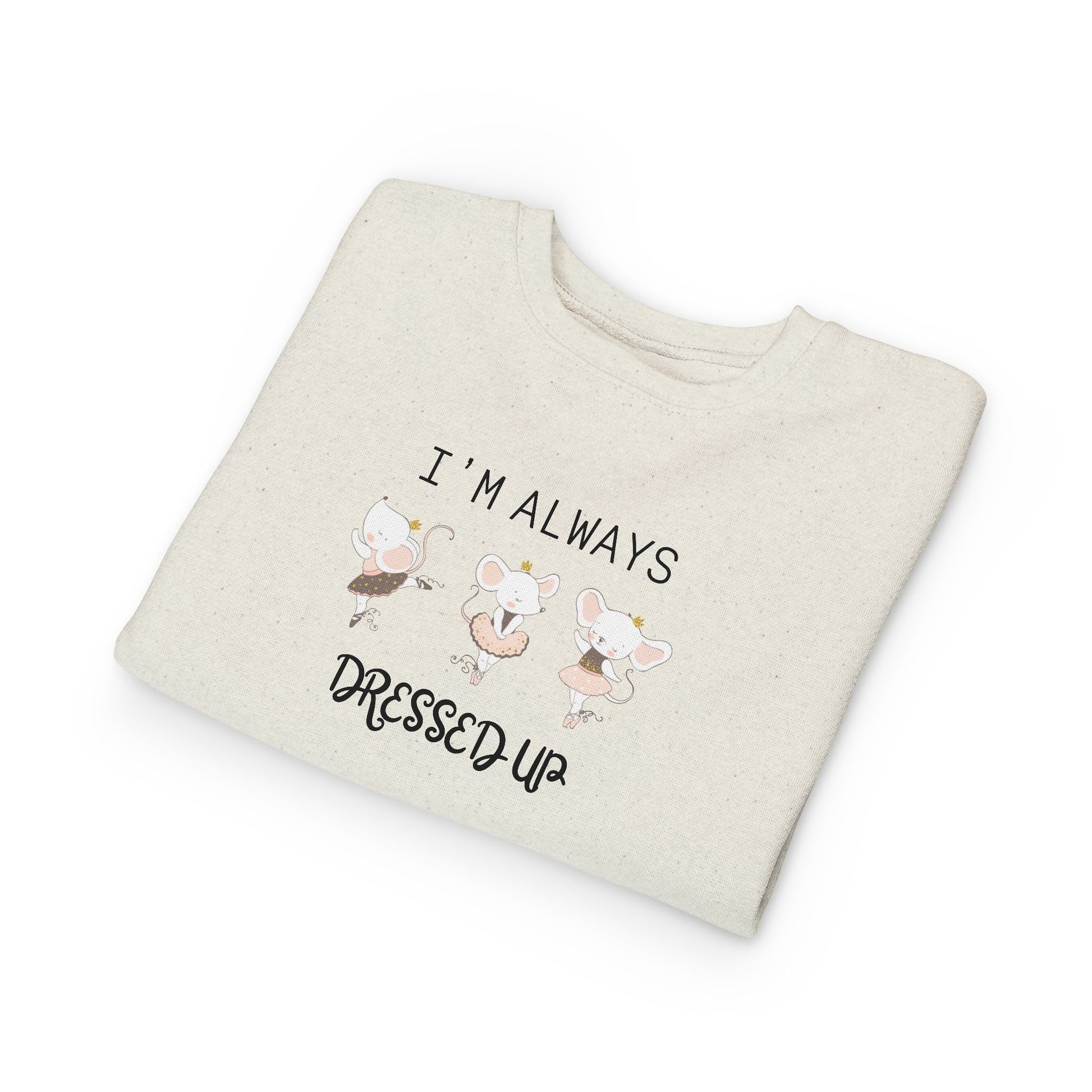 🐭✨ Cute, cozy, and always dressed to impress! This kids crewneck sweatshirt features three darling ballerina mice in sparkly tutus and crowns, dancing above the phrase “I’m Always Dressed Up.” Perfect for little ones who love to twirl, dress up, and show off their shining personalities. Soft and snuggly, it’s just right for playdates, dance class, or cozying up at home with their favorite stories.