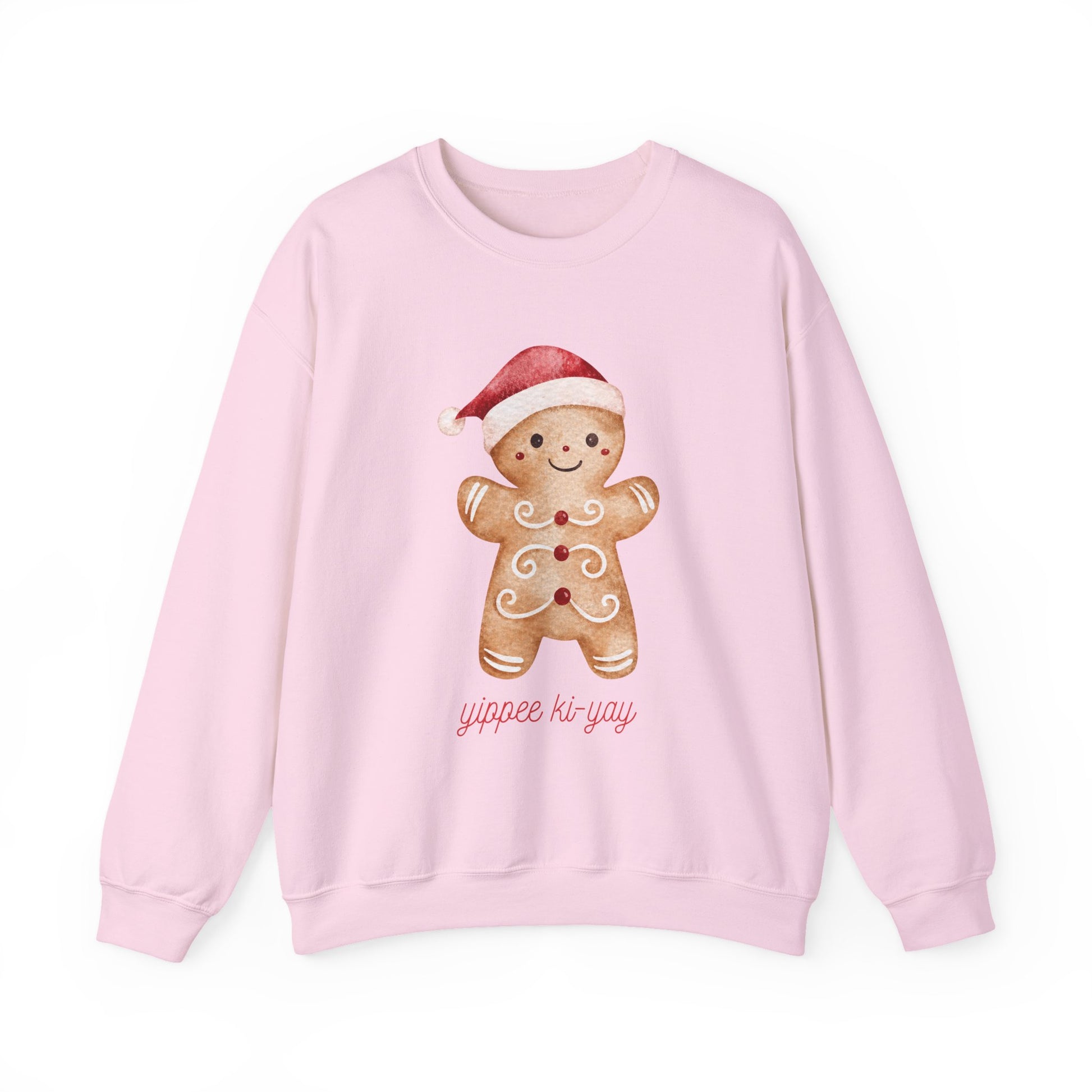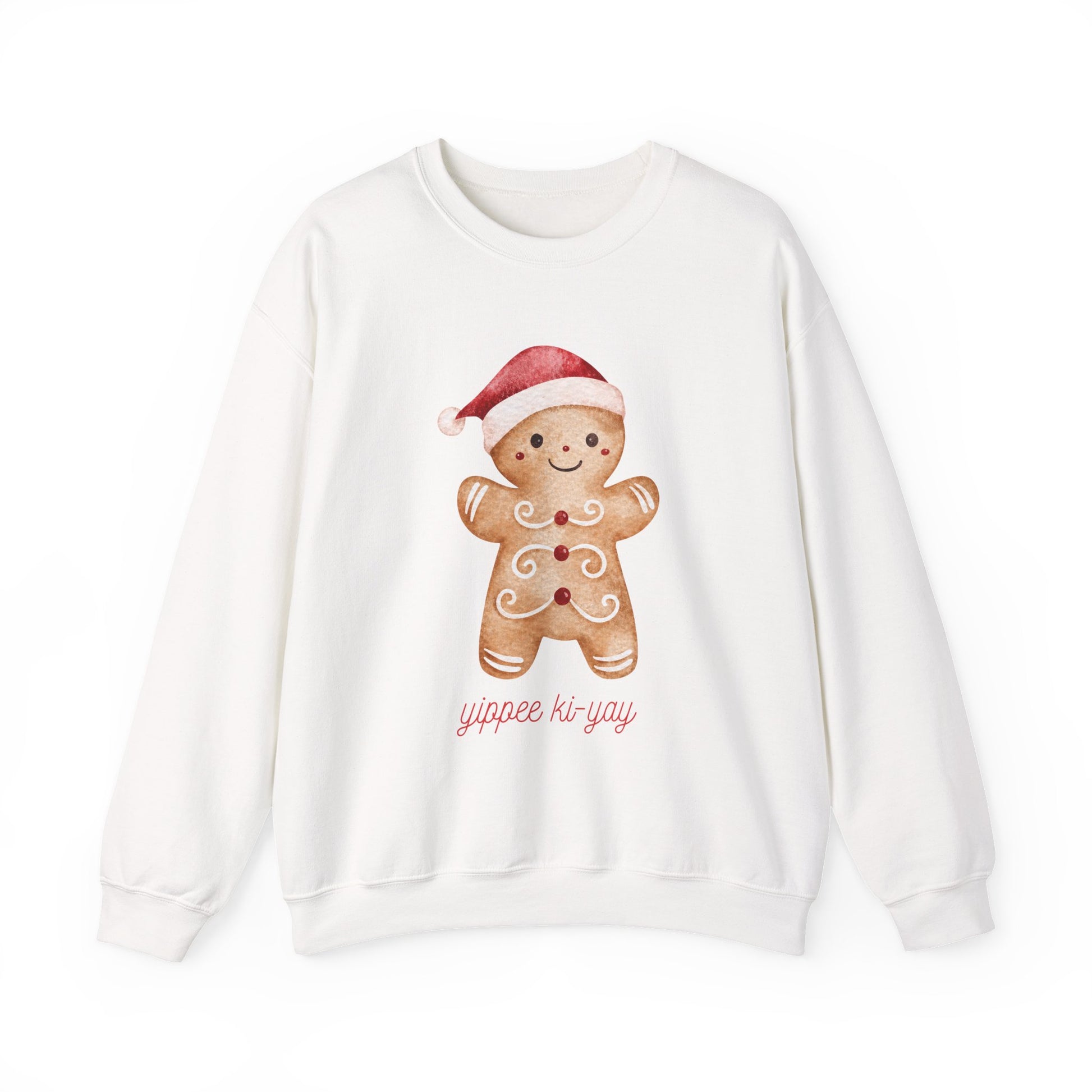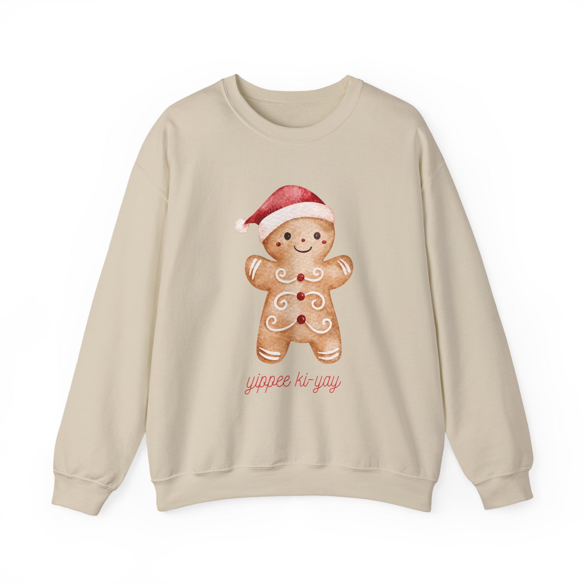 Crewneck Sweatshirt — Cute Gingerbread Cookie Santa Hat “Yippee Ki-Yay” Holiday Pullover