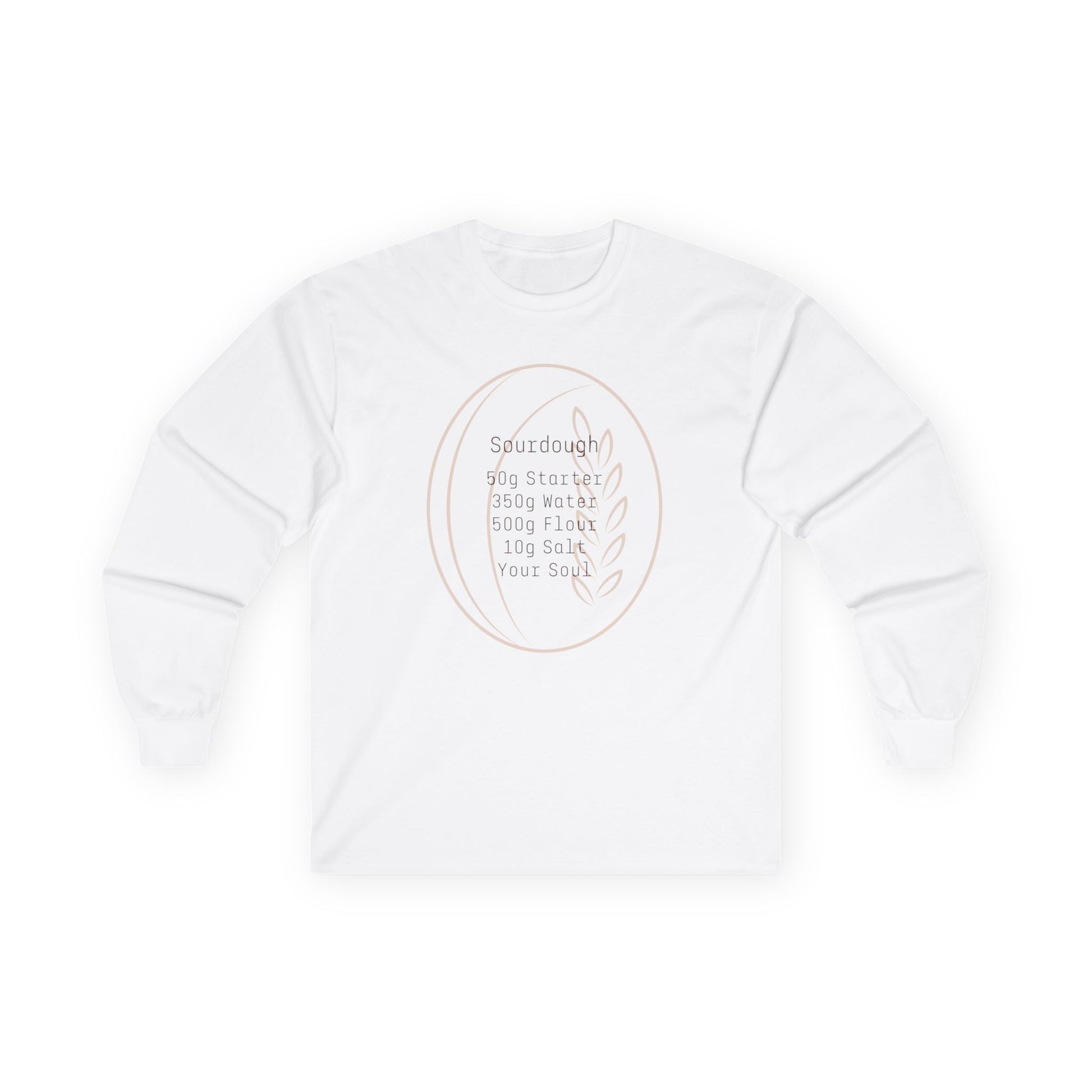 This long-sleeve tee carries a quiet, cozy energy—softly worn and gently vintage. The light, hand-drawn design highlights a beautiful sourdough loaf while providing the perfect recipe. Poking fun at the all-encompasing aspect of the sourdough movement, it sits close to the body in a classic unisex fit, with ribbed cuffs and collar that keep the shape wash after wash. The medium-weight cotton gives it weight without bulk, so it layers easily under jackets or stands on its own for cool evenings. Wear it for slow mornings of stretch and folds, coffee runs, or when you want something understated that still speaks to a calm, creative life.